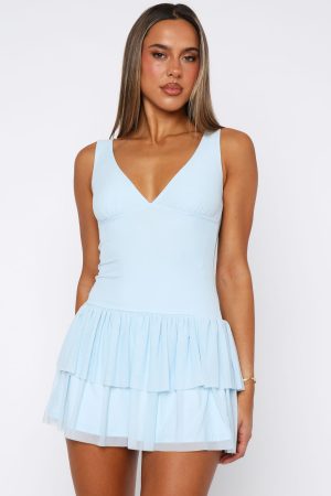 Float through summer in the Guessing Games Mesh Mini Dress in Baby Blue! Features thick straps. cheeky v-neckline. feminine drop waist design. frill skirt. lined and stretch fabrication for any easy slip on and off. Embrace your girly side by pairing with kitten heels and layered gold jewellery for a look we love!