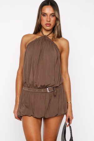 Festival mode: engaged. The Happy Girl Halter Neck Mini Dress in Mocha features self‑tie halter straps and a high elasticated neckline. it offers a loose. airy bodice balanced by a fixed waistband with a built‑in belt. silver buckle. and eyelet detailing. The bubble skirt with elastic hem swirls with every dance. fully lined and backless for that carefree festival vibe. Pair with kitten heels and layered gold jewellery to elevate the cool vibe.