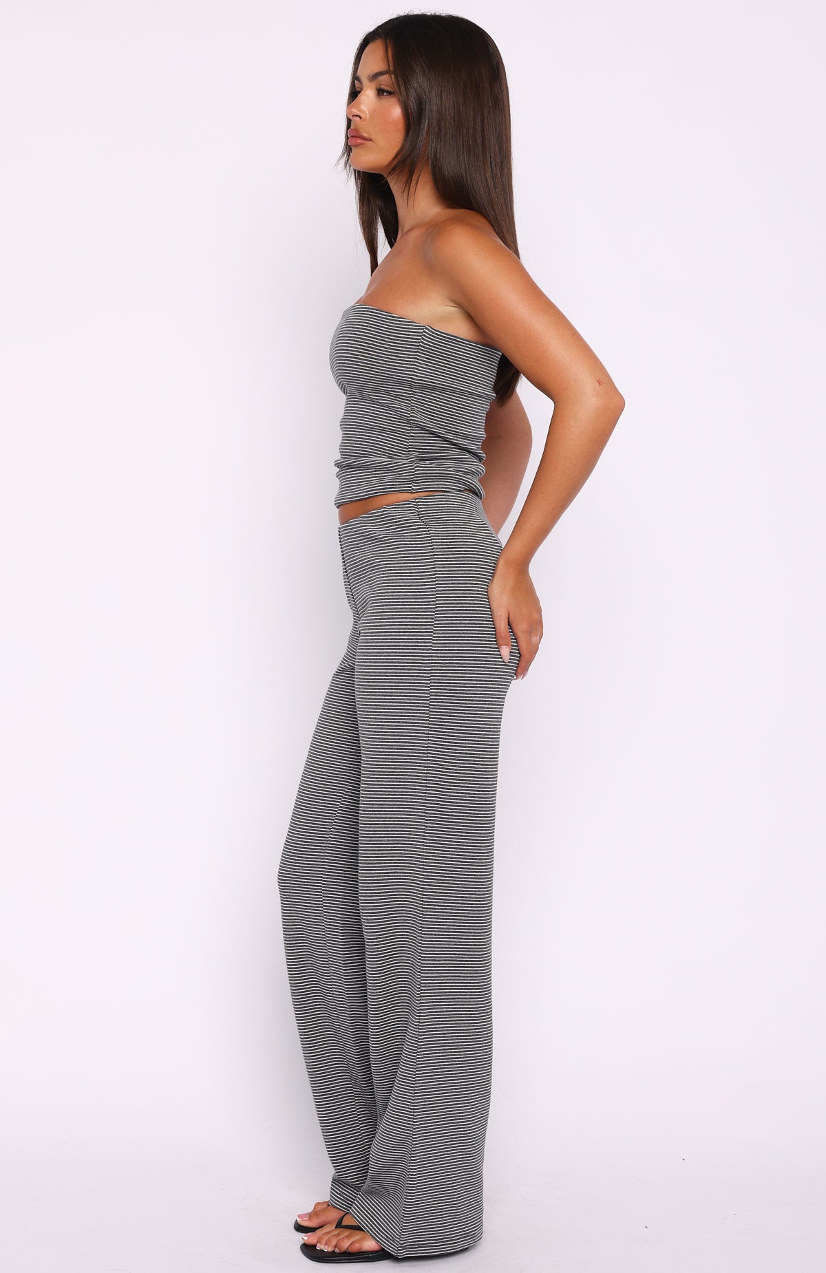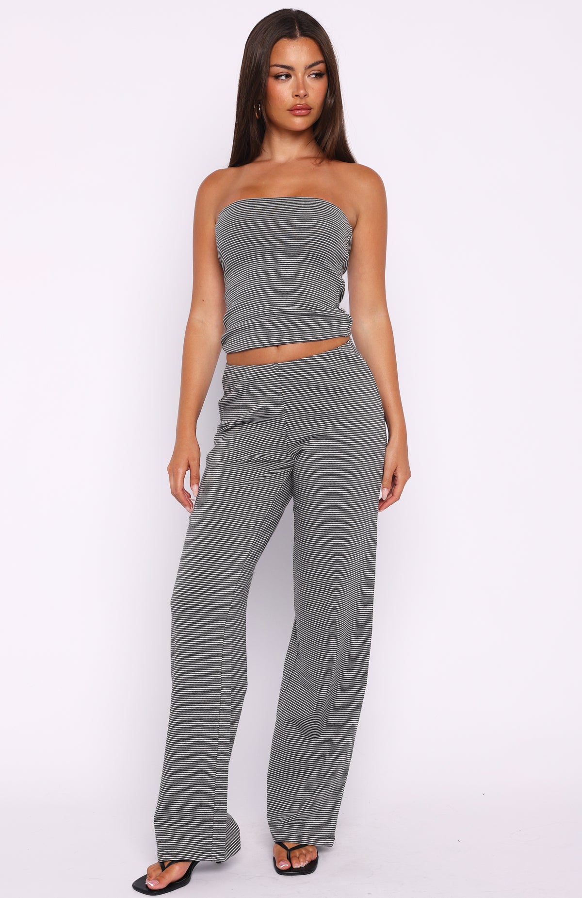 NEW TRENDING PRINT ALERT! The Happy It Happened Pants in Grey/White Stripe features a thin elastic waistband. comfortable high‑stretch fabrication. straight‑leg silhouette. and eye‑catching stripe pattern in unlined construction. Style them with the matching top and sandals for a chill weekend vibe that feels both fresh and effortless.