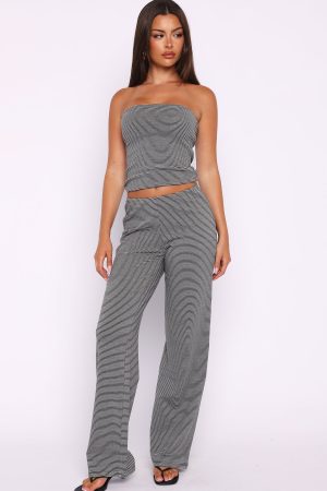 NEW TRENDING PATTERN ALERT! The Happy It Happened Strapless Top in Grey/White Stripe features a sleek strapless neckline and high‑stretch fabrication in an eye‑catching stripe pattern. perfect for warm‑weather style. Style it with the matching pants and sandals for a coordinated. effortlessly cool look.