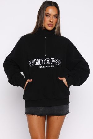 Embrace snuggle season in the Hard To Stay Focused Teddy Borg Zip Front Sweater in Black. This cozy piece features a high collar. long sleeves with ribbed cuffs. and a quarter zip front. The firm ribbed hem band adds structure to the oversized fit. while the unlined teddy fabrication ensures warmth without bulk. An embroidered White Fox logo at the center front adds a subtle touch of street style. Pair with your go-to denim jeans and sunnies for the perfect chill weekend fit.