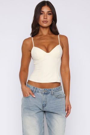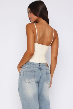 The Have A Nice Day Top in Off White brings a sense of elegance to an understated top. Features adjustable spaghetti straps. moulded bust cups with fixed padding for support and invisible zipper with hook and eye closure on side. Pair back with denim jeans and simple kitten heels for the perfect long lunch fit!