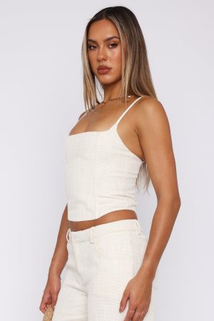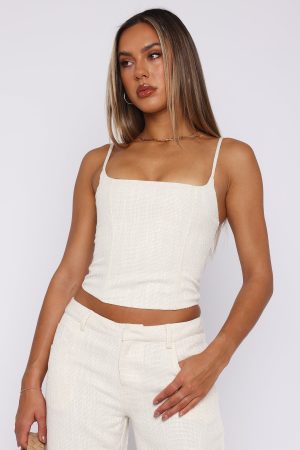 The Head Rush Bustier Cream will have you looking on trend all year round! Features thin adjustable straps. low cut neckline. boning in bodice. centre back zipper with hook & eye. cropped fit and hugging silhouette. Keep it cute and style with the matching Head Rush Pants for an off duty look!