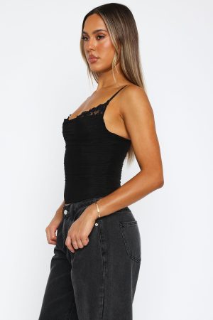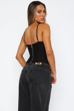 The Heavenly Image Bustier Black is so striking! Features thin adjustable straps. lace bust cups and underwire. gathered mesh design over bodice. slightly sheer. exposed silver back zip with hook & eye at back. Pair with your fave jeans and heels for that effortless look.