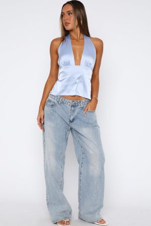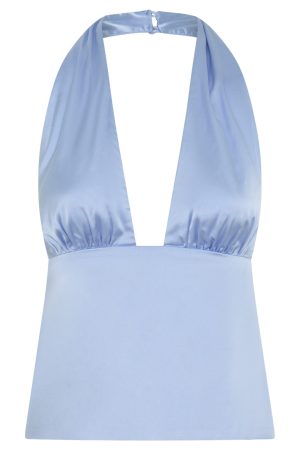 The Here For Me Halter Top Blue is the perfect blend of sexy and flattering for your summer adventures! Features halter neck with button closure. low plunge neckline. backless and thick self tie back straps to create a structured fit. Complete the look with a hint of sparkle in a mini skirt or accessories for the perfect summer fit.