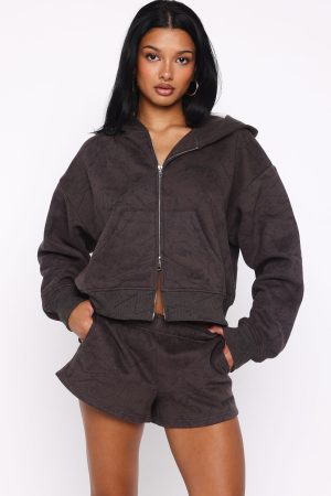 From couch cuddles to coffee runs. this set does it all. The Hiding Away Boxy Zip Front Hoodie Dark Camo are designed with a relaxed hood. slouched shoulders and ribbed hems which round out an boxy silhouette. Featuring long sleeves. front zipper closure. a roomy front pocket. and an unlined fleece interior. this hoodie delivers a cozy feel. White Fox puff‑print text embellishes the side front. Style with the matching Hiding Away Lounge Shorts Dark Camo or Hiding Away Wide Leg Sweatpants Dark Camo.
