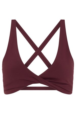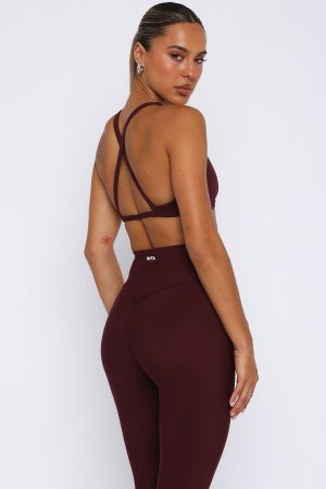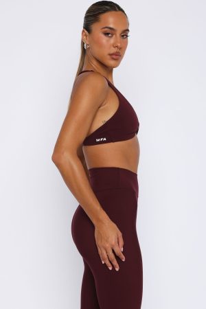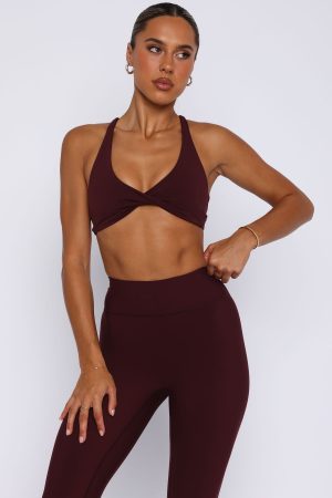Elevate your gym-drobe with the High Definition Sports Bra in Merlot. Features a plunge neckline. thick stretch straps. fitted design. criss-cross back design. lined. removable padding and custom patch detail. Pair with the matching Keep Up High Waisted Shorts 4 Merlot or Go Getter High Waisted Leggings Merlot!