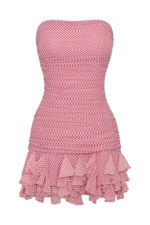 The High Gloss Strapless Mini Dress in Pink Polka Dot is your ultimate evening companion. It features a strapless neckline with grip tape. internal boning. subtle side ruching. and a fitted bodice. The drop waist silhouette is accentuated with a frill sash at the skirt hemline. An invisible side zipper with hook-and-eye closure ensures a seamless fit. while the full lining provides comfort. Feely girly by pairing with kitten heels and layered gold jewellery.