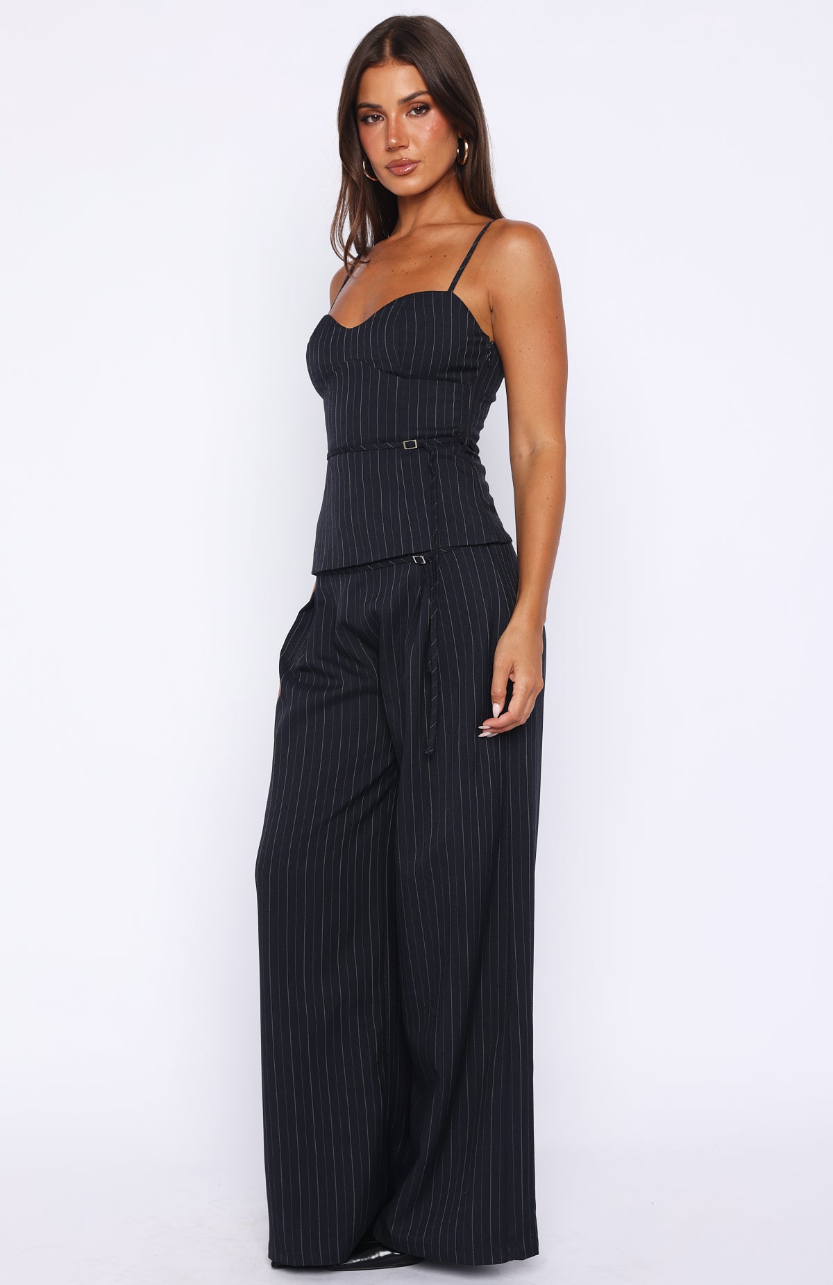 Office-siren energy in the High Line Pants in Navy Pinstripe. They feature a fixed waistband with side zipper and hook-and-eye closure. a fixed thin belt with buckle. a wide-leg silhouette and classic pinstripe detail. Style them with the matching bustier and blazer plus kitten heels for a polished. powerful look.