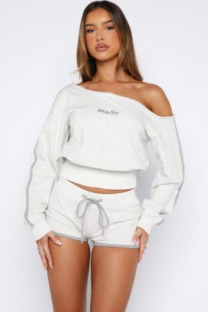 Pilates queens listen up! Introducing your next fav sweater. the High Roller Long Sleeve Sweater in Grey Marle! Features a one shoulder neckline. long sleeve with stripe design and ribbed cuffs. cursive stitched White Fox text centre front and thick ribbed hemline for a cinched waist. Have a matching moment by pairing with the High Roller Shorts in Grey Marle.