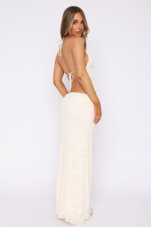 Your go-to for those chic afternoons. The Hold Out Maxi Skirt Cream features a thin elasticated waistband. front adjustable drawstring. maxi length. lined fabric. gorgeous textured fabric and lightweight. Pair with the matching Hold Out Halter Top Cream for a super chic look!