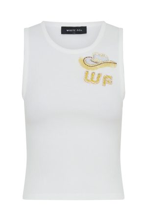 Your new statement summer tank has arrived! The Honey Please Rib Tank White/Yellow features a high neckline. sleeveless. ribbed. stretch material for an easy slip on design and the cutest beaded WF logo side front.