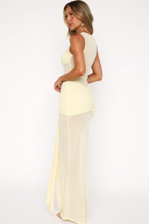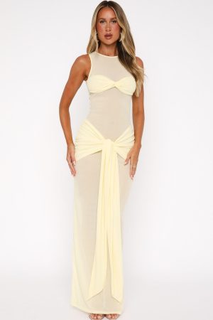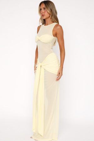 Make it all about you in the Honeymoon Heart Maxi Dress Lemon! Featuring a high cut neckline. unlined. sheer bodice with lining at bust and skirt. front wrap design. maxi length. ruched detailing. and stretch material for an easy slip on design.