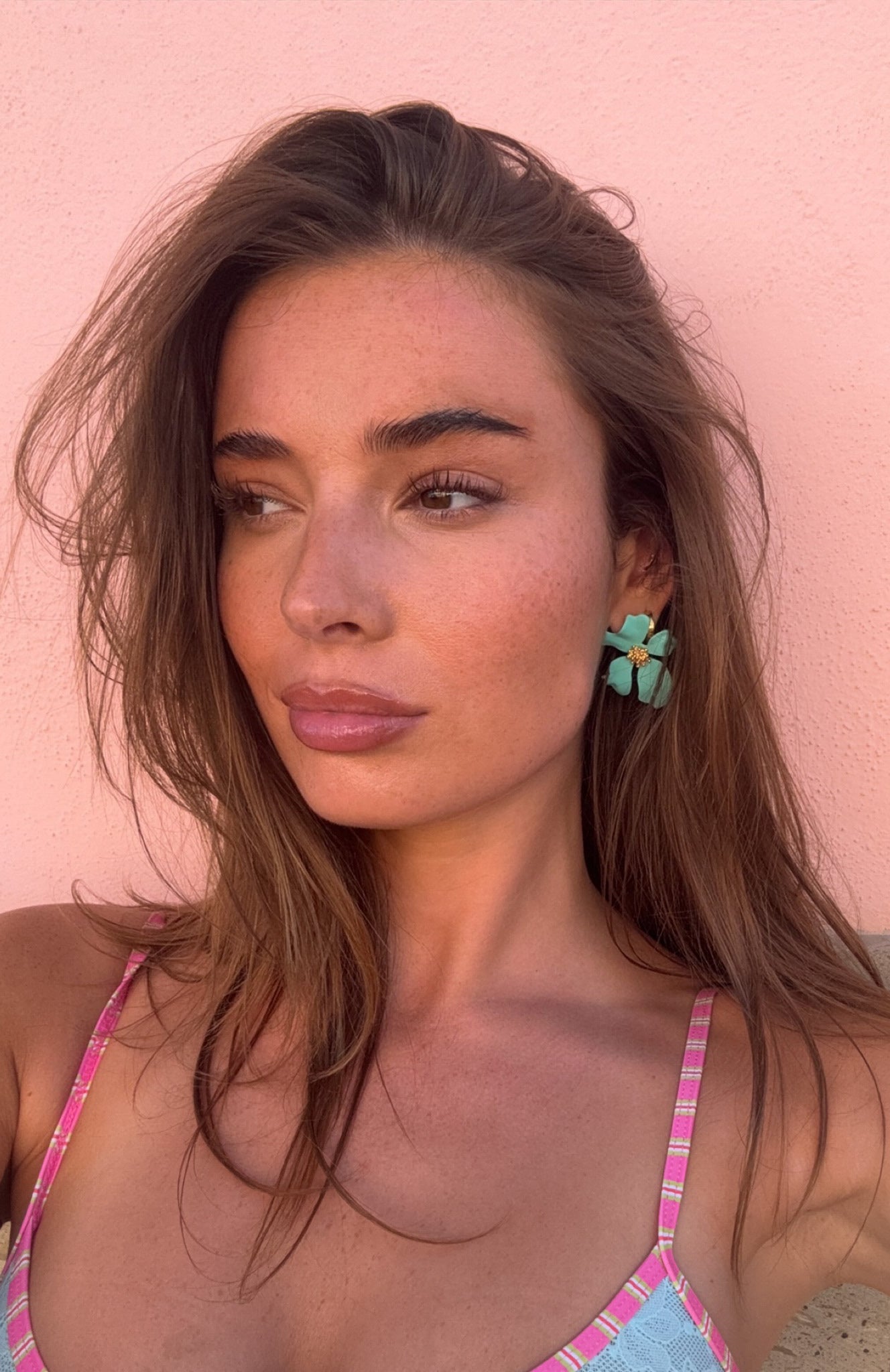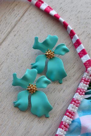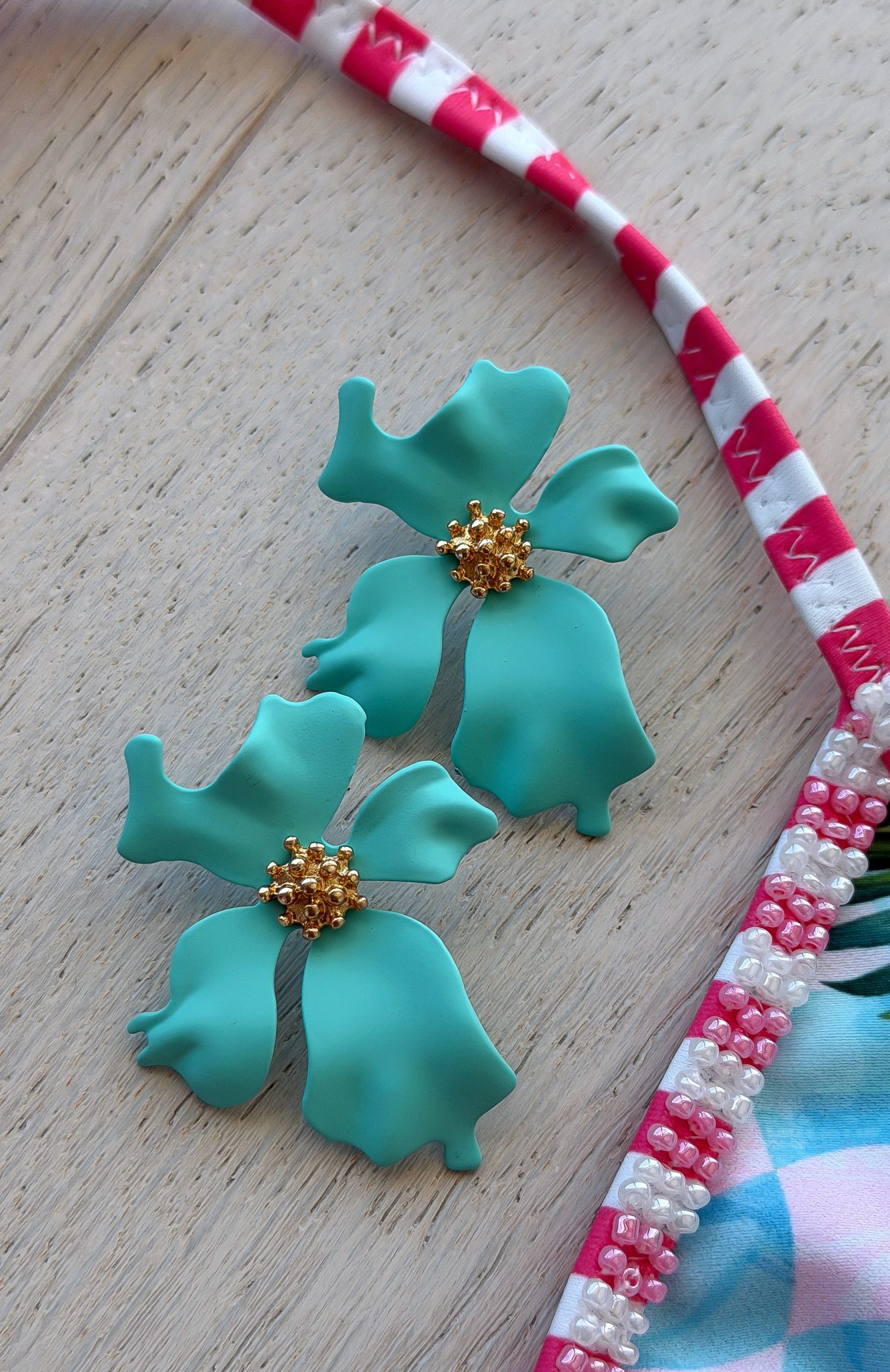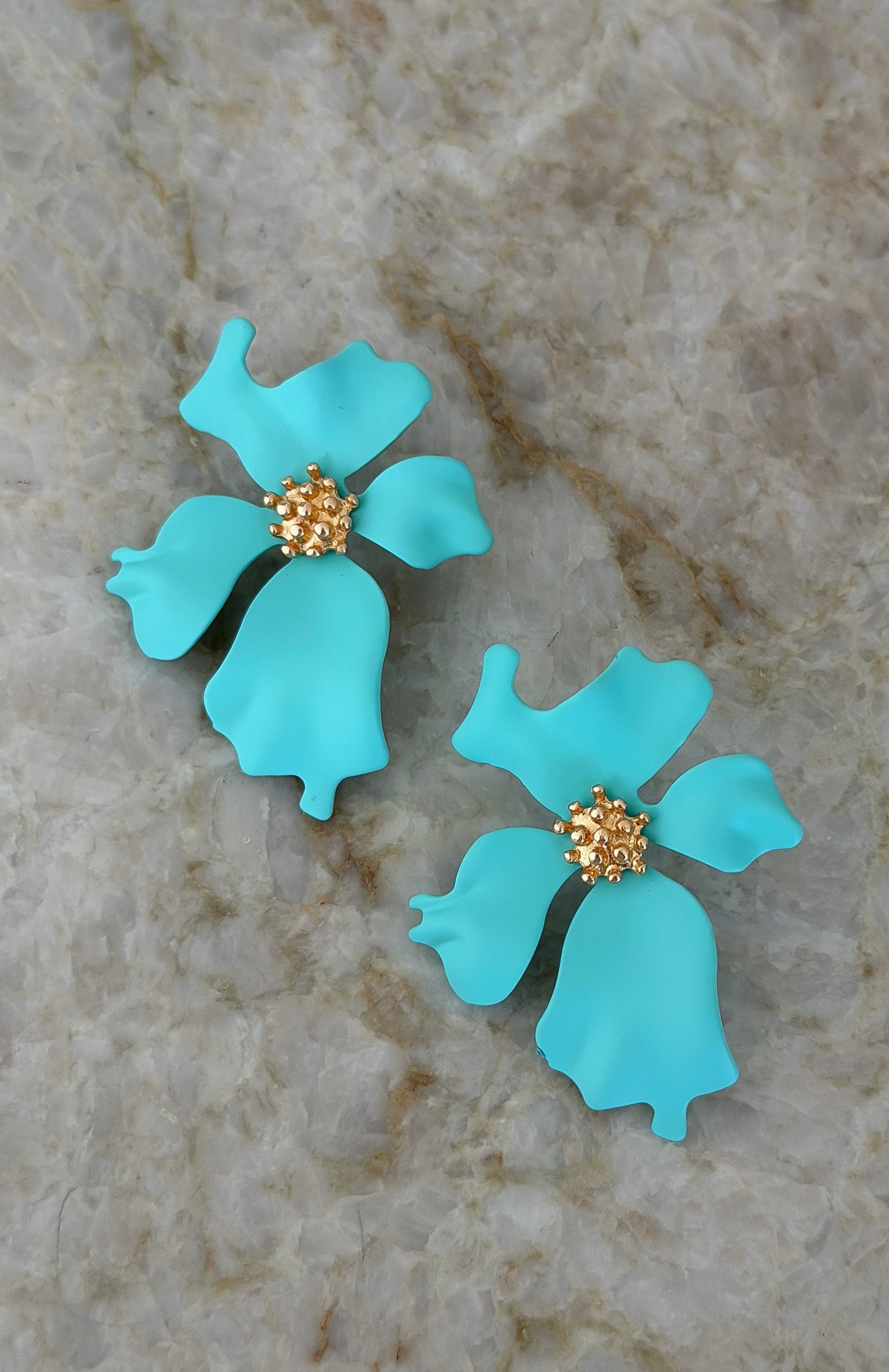 Make a statement this spring with the Hopper Earrings Aqua/Gold. Featuring a floral‑inspired design with an easy stud back. these aqua and gold earrings bring a fresh pop of colour to any outfit. Style them with a mini dress and heels for vibrant. sun‑soaked looks that turn heads from brunch to sunset.