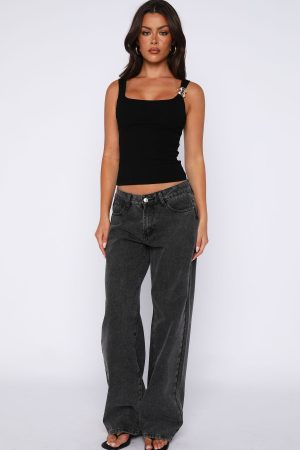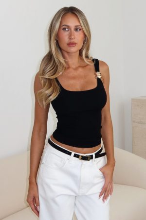 The Horizon Heat Tank Top in Black offers a modern twist on a classic wardrobe staple. Designed with thick shoulder straps and gold hardware detailing on one side. it features a square neckline and ribbed fabrication for added texture. The fully lined. high-stretch fabric ensures a fitted silhouette that flatters the figure. Style with the jeans. sandals and sunnies for the perfect shopping fit.
