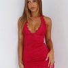 Celebrate the season in style with the Hunny Bunny Mini Dress Chocolate. Features a halter neck style with button and loop closure. ultra low plunge neckline. lined. gorgeous lace material. mini length. elasticated around bust. and invisible back zipper and clasp closure. Pair with pointed toe heels and a shoulder bag for a look we adore!