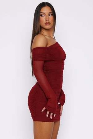 Perfect for those PM days! The I Feel Love Long Sleeve Mini Dress Burgundy features a one shoulder design. unlined at neckline. ruched fabric design. mesh. lined. long sleeve design. mini length and high stretch for an easy slip on design. Keep the vibe going and pair with perspex heels and gold accessories!