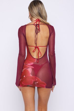 I need vitamin sea. The Ibiza Sands Long Sleeve Mini Dress in Paradise Bloom features a jewel neckline. long sleeves. a open back with self-tie. and high-stretch. sheer fabrication. Style it with a matching Paradise Bloom bikini set for effortless beach vibes.