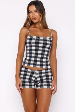 Romanticize your life in the Iconic Duo Knit Mini Shorts Navy/Cream Gingham! Features a thick elastic waistband. a soft high‑stretch unlined fabric that hugs beautifully. and a chic gingham check that brings vintage charm. They’re best styled with the coordinating Iconic Duo Knit Cami Top. a crochet head scarf and boots for a statement look.
