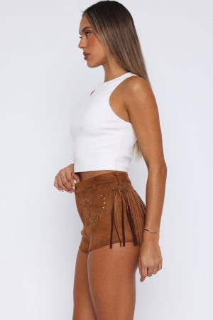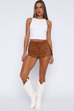 The If I Had A Heart Suede Shorts Almond are your ticket to rodeo-ready style! Featuring a front button and zipper closure. ultra booty short length. back tassel detailing. front studded design. belt loops and unlined material.