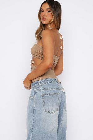 Channel your inner goddess in the If You Know Halter Top in Champagne! Features a chain halter neckline adorned with chunky beadwork which can be worn straight or crossed at the front. Designed with integrated grip tape at bust. and purposeful cut-out at the waist framed with coordinating chains and beads. Crafted from a high‑stretch. lined fabric. it’s elegantly backless. Finish the look by pairing with a mini skirt. heels and layered gold jewellery.