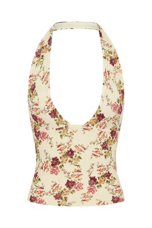 Embrace sunny days with the If You Please Halter Top in Antique Garden. This playful piece features a halter neck design. lined printed lace fabric. cropped length. backless design. front low plunge neckline. and stretch material for an easy slip on design. Perfect for warm weather. it pairs effortlessly with the matching If You Please Mini Skirt for a fun. flirty look.