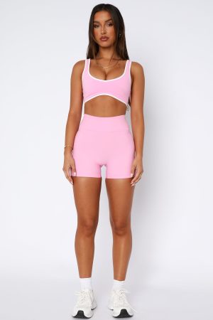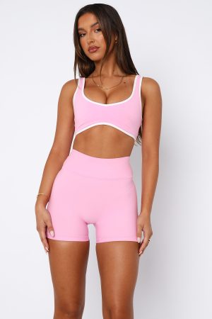 Elevate your gym-drobe with the I’ll Prove It Sports Crop in Baby Pink/White. Features a plunge neckline. thick stretch straps. fitted design. low back. lined. removable padding and custom patch detail. Pair with the matching Keep Up High Waisted Shorts for a look we are loving!