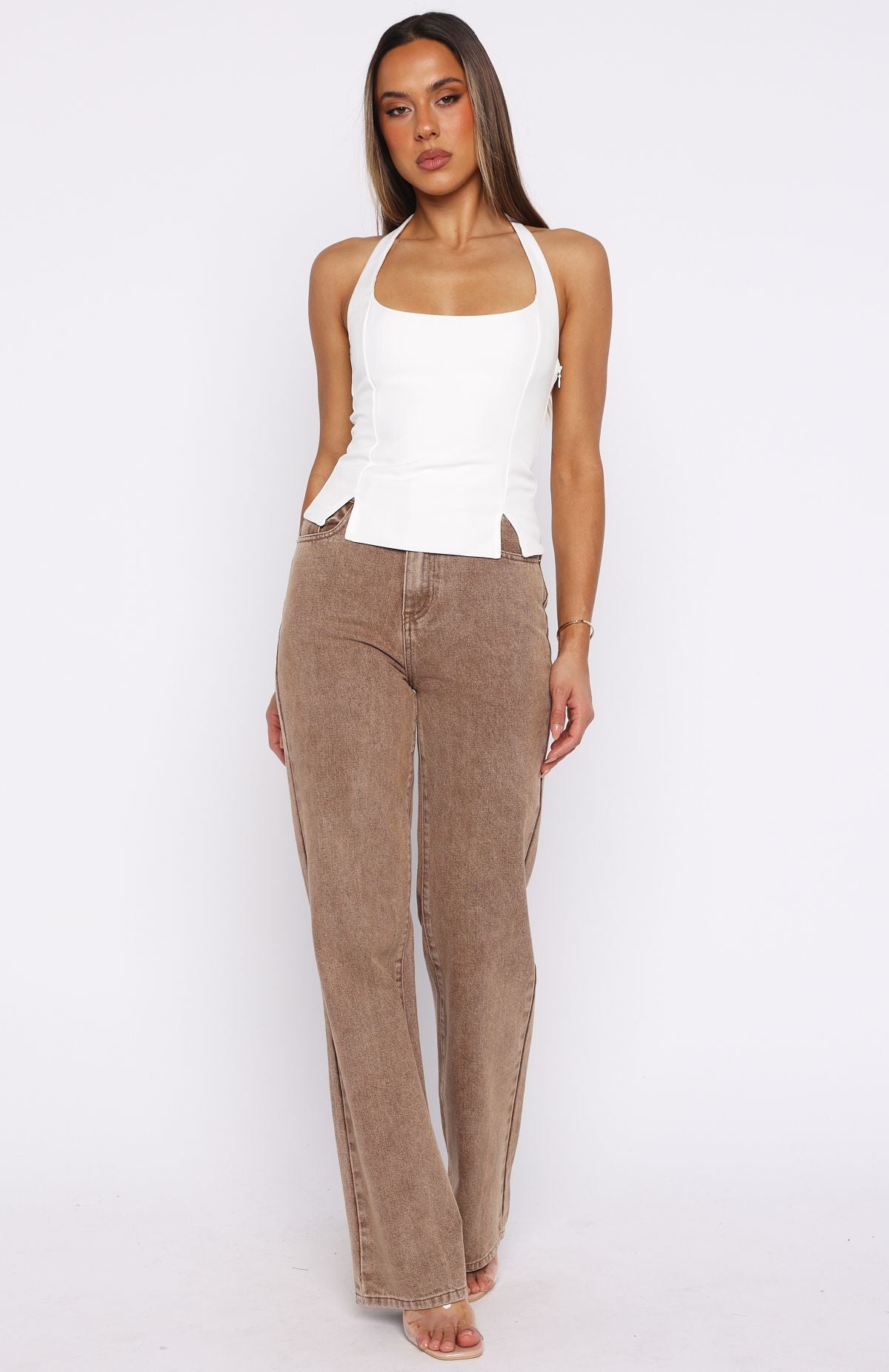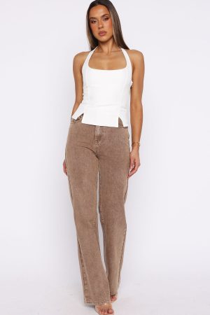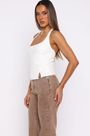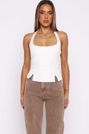Sculpting silhouettes! The I’m Next Halter Top in Off White features halter straps. a square neckline. and a fitted bodice that flatters your form. A button closure at the nape and side zipper ensure a seamless finish. while the hem slit adds a touch of edge. Pair with jeans. boots. and layered gold jewellery for a concert‑ready ensemble.