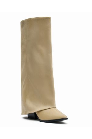 Put your best foot forward and step out in style. The I’m That Girl Knee High Boots Neutral Faux Suede features a square block heel. pointed toe and fold over design.