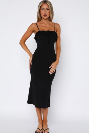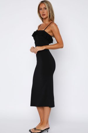 The I’m Your Favourite Midi Dress Black is your ultimate statement for dinner date nights! Features thin adjustable straps. square neckline with ruffle detailing and self tie bow centre front. lined and stretch fabrication for an easy slip on and off. Keep things simple by pairing with kittens heels and a shoulder bag.