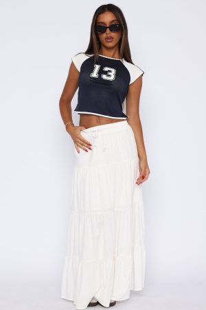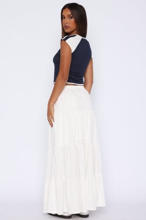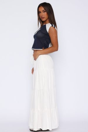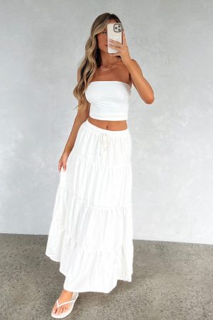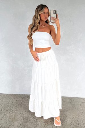 Embrace the warm weather with the In That Moment Maxi Skirt White! Features a thick waistband and adjustable draw string. lined fabric and maxi length. Pair with a strapless top and thong heels for a vacay ready fit!