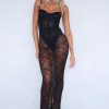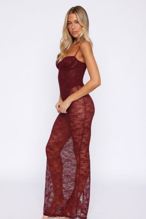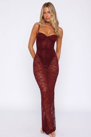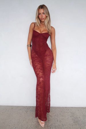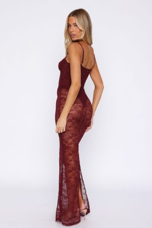 The In The Atmosphere Lace Dress in Wine features adjustable spaghetti straps. sweetheart neckline with boning to add structure. underlay bodysuit with cheeky bottom cut. thick internal elastic band with hook closure for a cinched fit. sheer lace fabrication and back leg split for ease of walkability. Pair this flirty number with heels and gold jewellery for a fit we are obsessed with!