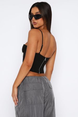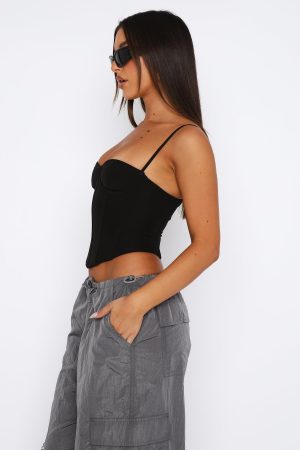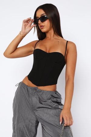 The In The Morning Bustier in Black is a weekend staple. Featuring thin. adjustable straps. bust underwire. boning in bodice. zipper centre back and lined fabric. Pair with a cute mini skirt and perspex heels for a dreamy look!