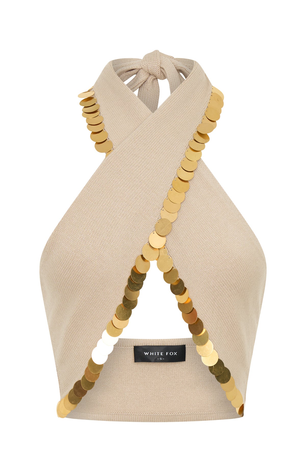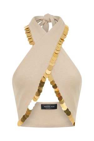 Turn up the heat in the In The Night Knit Top in Oat! Features thick self tie halter straps. cross over fabrication at bust. elasticated hem to ensure it sits perfectly and gold disc sequin embellishment across hem of neckline. Finish the fit off with the matching In The Night Knit Mini Skirt in Oat.