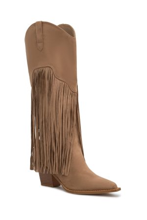 Desert but make it fashion. The Iniko Cowboy Boot in Taupe Faux Suede features a rugged western style with a sleek pointed toe. fringe detailing. chunky heel and knee-high silhouette for a standout festival look.