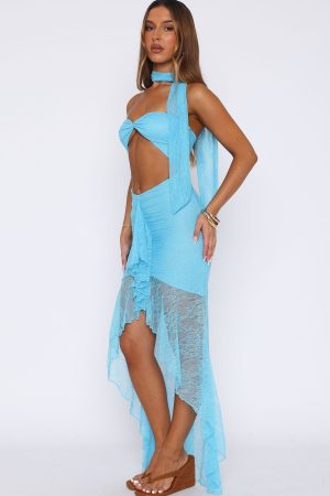 Breezy by day. boujee by night. The Inner Goddess Lace Maxi Dress Blue features a detachable neck tie. strapless design with gel grip at bust. centre front cut out. lined bodice. sheer lace skirt design with centre front frill detailing and stretch material. Complete the look with the Josie Sandals and layered jewellery for a look we love.