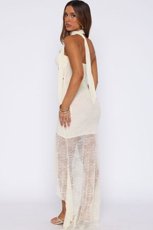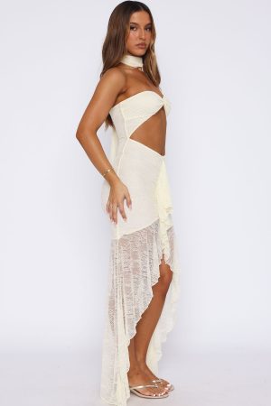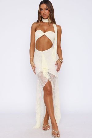 Breezy by day. boujee by night. The Inner Goddess Lace Maxi Dress Lemon features a detachable neck tie. strapless design with gel grip at bust. centre front cut out. lined bodice. sheer lace skirt design with centre front frill detailing and stretch material. Complete the look with the Josie Sandals and layered jewellery for a look we love.