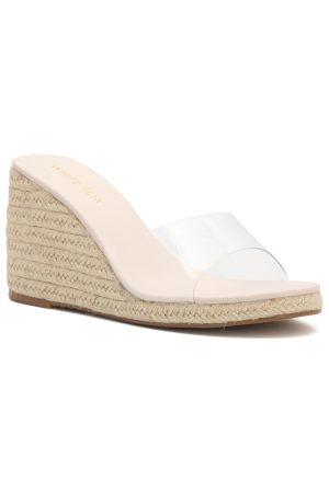 Unleash your ultimate shoe fantasy with the Isla Wedge Natural Woven! Featuring a high woven wedged heel. open rounded toe design and soft clear vinyl toe strap.