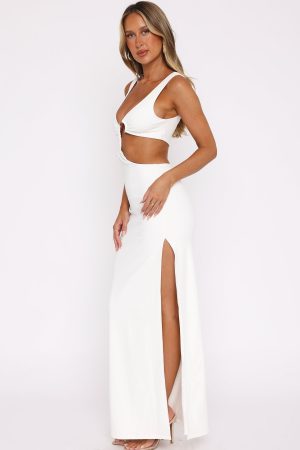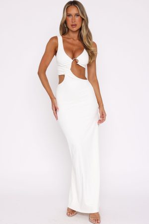 If cocktails by the beach were a dress. it would be the It Feels Wrong Maxi Dress Off White! Featuring thick shoulder straps. plunge neckline. centre cut out detailing with hardwire detailing. maxi length. side split and slight stretch material.