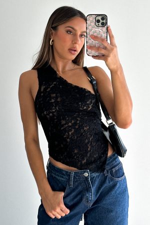 Effortlessly combining street cool and versatility. introducing the It’s A Love Story Top Black. Features a one shoulder design with thick tie-up straps. asymmetric hemline. and self-lined. sheer. lace fabric. Pair with a low rise jean and platform heel for an on trend look worthy of your next insta post! We’re in love!