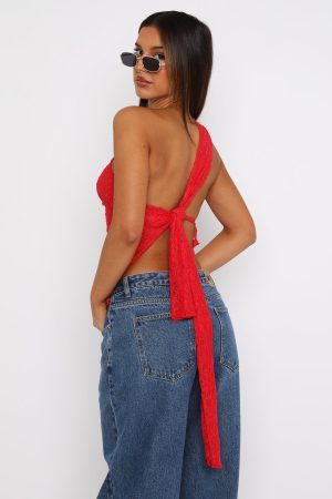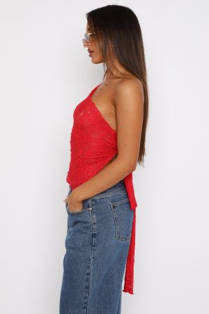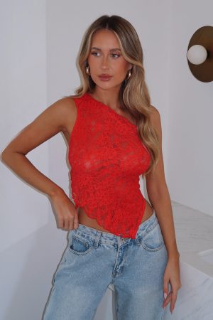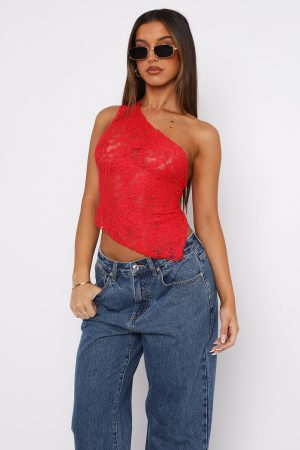 Effortlessly combining street cool and versatility. introducing the It’s A Love Story Top Red. Features a one shoulder design with thick tie-up straps. asymmetric hemline. and self-lined. sheer. lace fabric. Pair with a low rise jean and platform heel for an on trend look worthy of your next insta post! We’re in love!