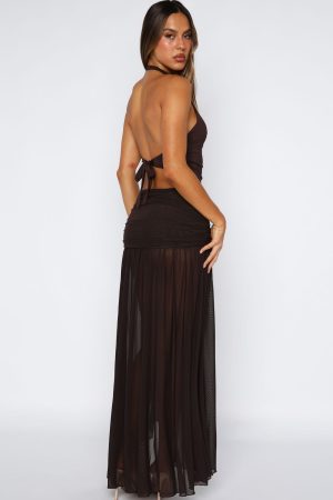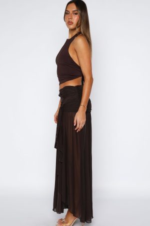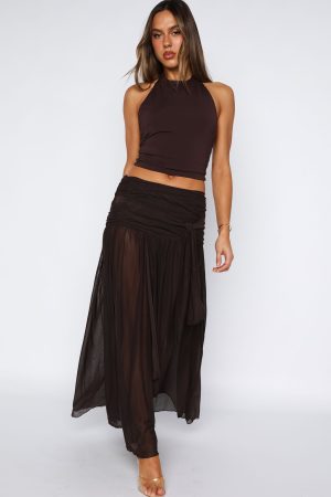 Let them stare when you slip on the Meet It’s Showtime Maxi Skirt in Chocolate—your new must‑have staple. With a thick lined waistband featuring ruched side detailing and a chic knotted sash. this sheer. flowy maxi is crafted from ultra‑stretch lightweight fabric for all‑day comfort. Style with a basic top. kitten heels and layered gold jewellery!