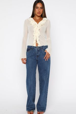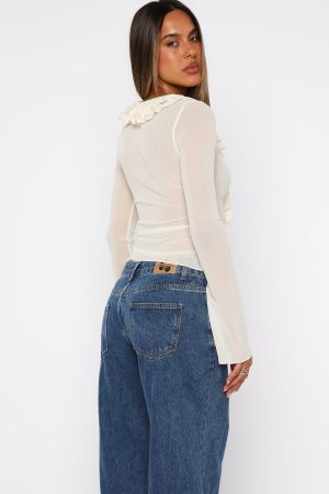 Turn heads effortlessly with the Just Me Long Sleeve Top in Butter. With a soft V‑neckline and cascading ruffle detail down the bodice. this top brings instant polish to your everyday wardrobe. Features flared long sleeves. semi‑sheer high‑stretch fabric and button‑down bodice. Pair it with your favourite jeans and simple sandals for a chic yet relaxed look.