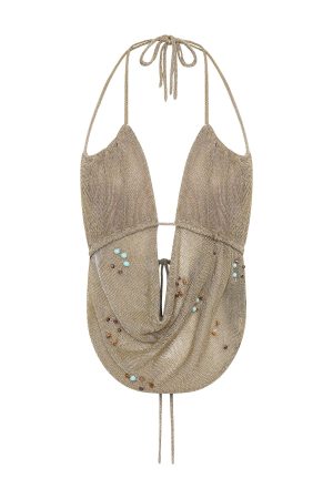 Headline worthy shine. The Just Out Here Knit Top in Gold features double self-tie halter straps and a plunging neckline with soft cowl drape for a flattering silhouette. Designed with adjustable back straps. a backless design and multicoloured scattered bead detailing. Crafted in a shimmering knit with metallic thread and fully lined at bust. Style with the matching Just Out Here Knit Booty Shorts standout glamour with every wear.
