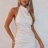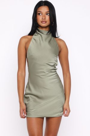 Dance floor ready in the Just Small Talk Halter Mini Dress in Khaki. This backless beauty features adjustable halter straps with button closure. cowl neckline. a fully lined fitted silhouette and hidden centre‑back zipper with hook and eye closure. Pair it with gold accessories. a mini bag. and clear heels for maximum impact.