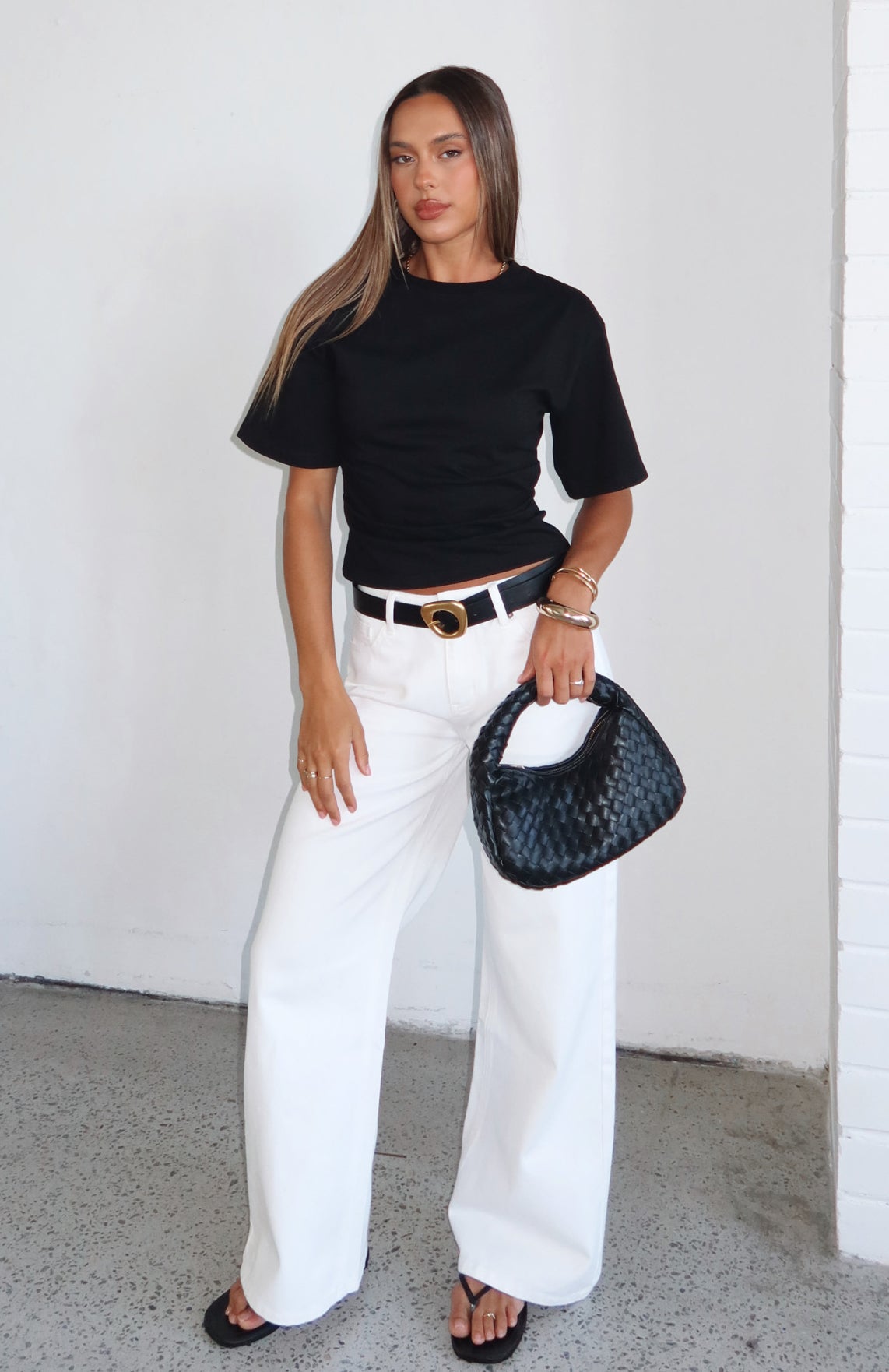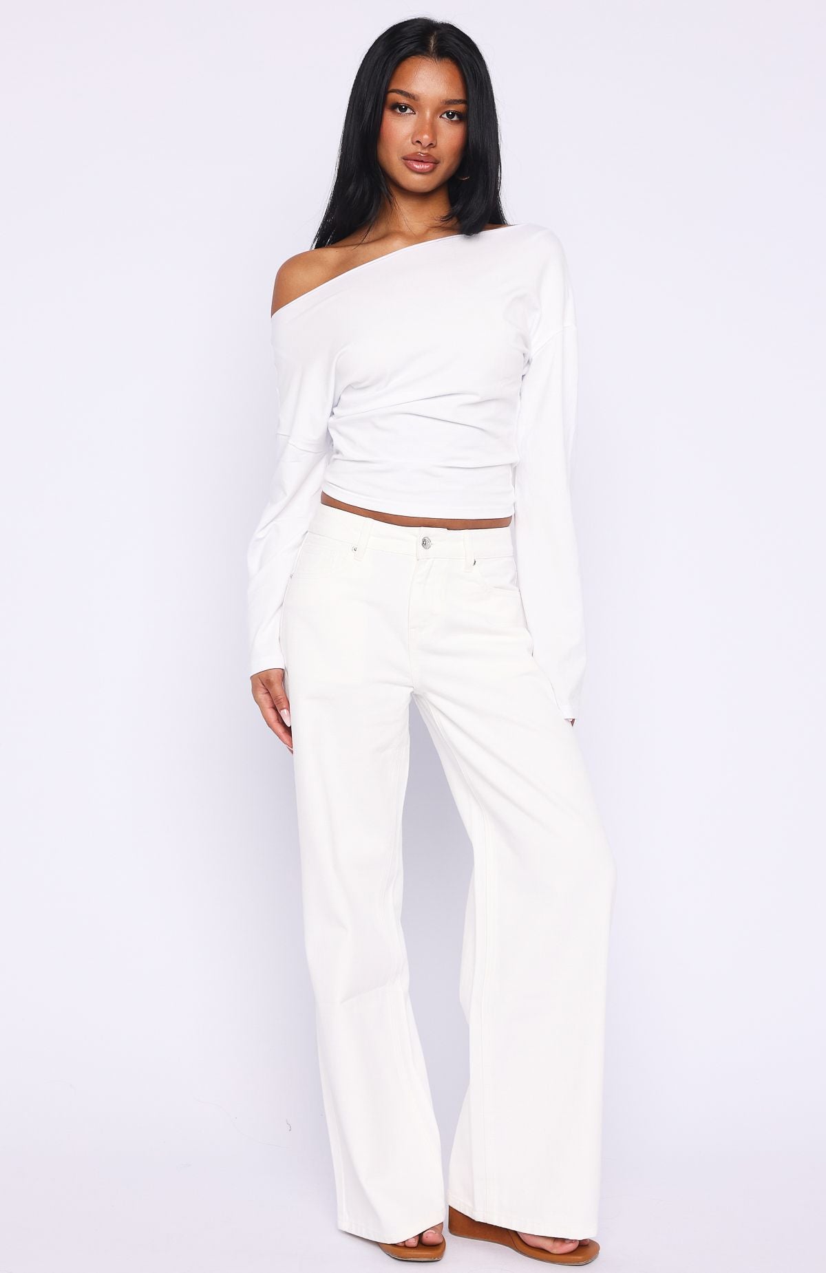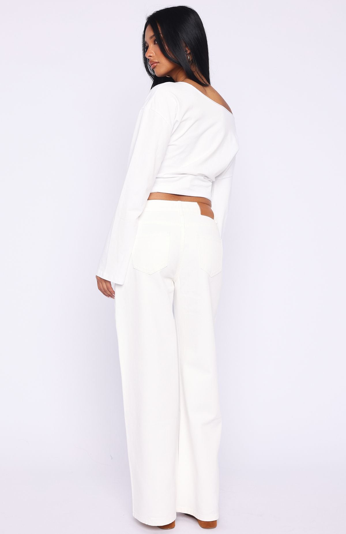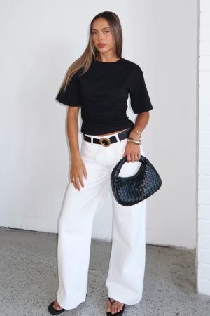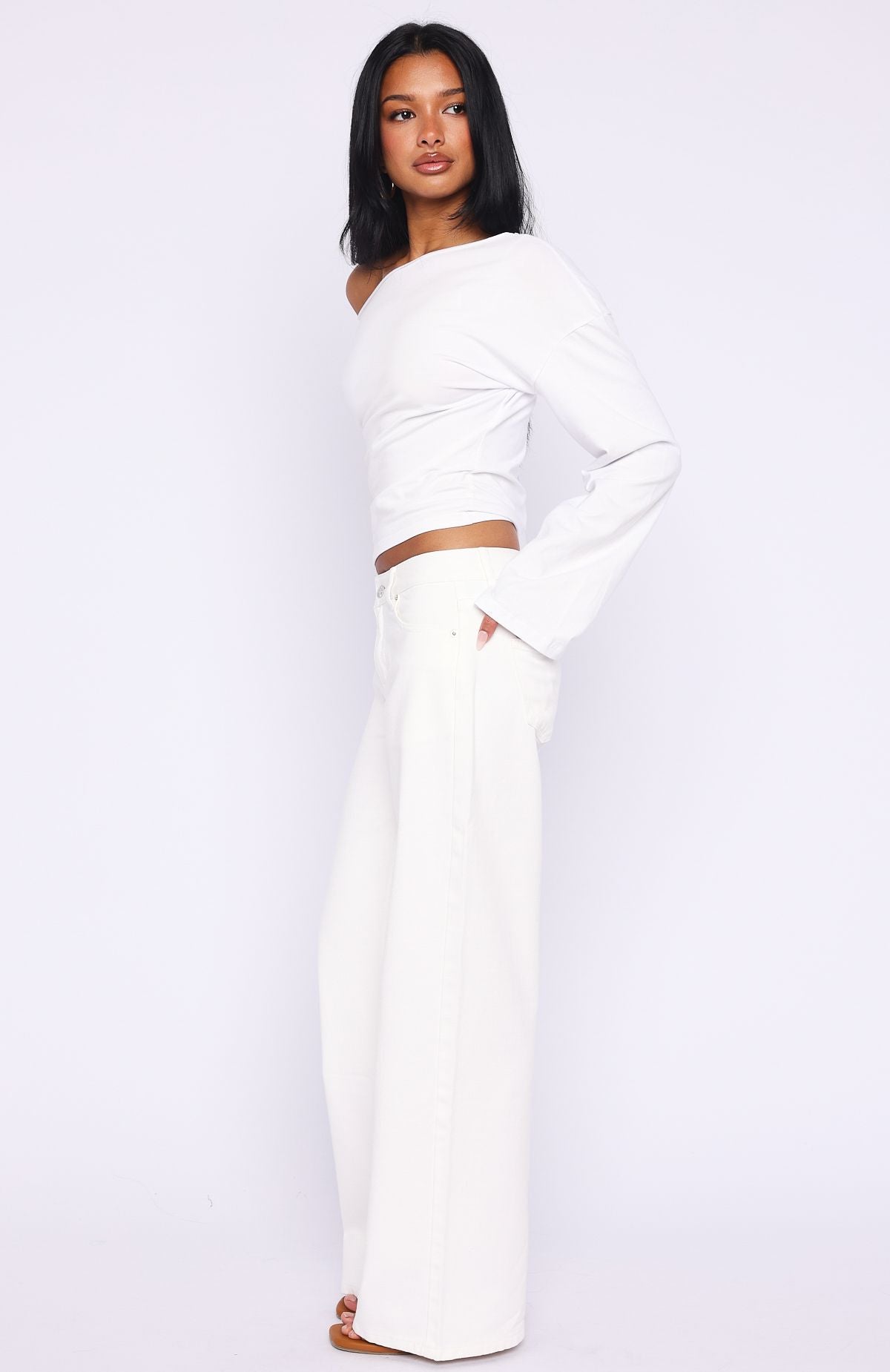 Outfit game strong in the Kalaya Mid Rise Wide Leg Jeans in Off White. With a mid-rise waist. relaxed wide-leg silhouette. classic button and zip closure. belt loops. a timeless 5-pocket design and a faux leather label side back. these jeans bring effortless style. Style them with a simple tank. sandals and layered gold jewellery for an easy. chic summer look.