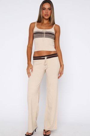 The Keep Driving Knit Cami Top in Chocolate Stripe is the perfect blend of cute and comfortable! Features thin straps. subtle round neckline. self tie bow centre front and ribbed fabrication on waist for a cinched look. Feel your cutest by pairing with the matching Keep Driving Knit Pants in Chocolate Stripe.