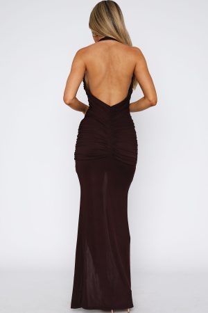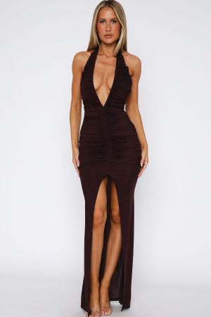 Create a jaw dropping entrance in the Keep Me Close Maxi Dress in Chocolate! Features a halter neckline. low plunge. ruching detailing. front leg split. backless and lined. Complete the look with a clear heel. gold accessories and shoulder bag for a look we can’t get enough of!