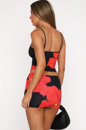Take on this seasons trend in the Keep Up With Me Top Scarlet Noir! Features a scoop neckline. thin adjustable straps. cropped fit and stretch fabric. We love this top paired with the matching Late Nights Mini Skirt to show off your summer glow!