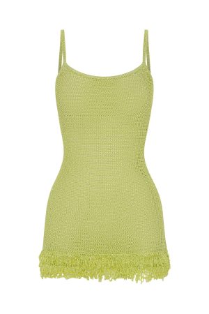 Go from beach to bar in the Keeping Me Awake Knit Mini Dress Apple. Features thin adjustable straps. square neckline. unlined. sheer. mini length. stretch material for an easy slip on design and frayed hem detailing. Style with kitten heels and a statement necklace for a look that’s sure to turn heads!